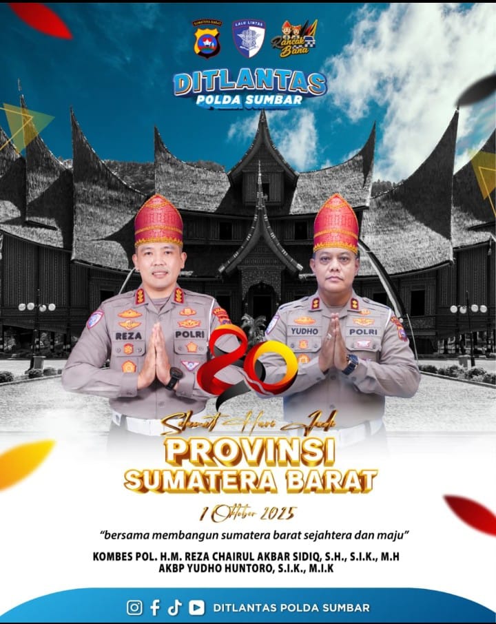 Hari ini, Provinsi Sumatera Barat genap berusia 80 tahun. Sebuah usia yang sarat makna bagi daerah yang dikenal dengan adat basandi syarak, syarak basandi Kitabullah. Dalam momentum bersejarah ini, Direktur Lalu Lintas (Dirlantas) Polda Sumbar, Kombes Pol. H.M. Reza Chairul Akbar Sidiq, S.H., S.I.K., M.H menyampaikan pesan mendalam tentang arti kebersamaan, pengabdian, dan komitmen untuk membangun tanah Minangkabau yang semakin maju.